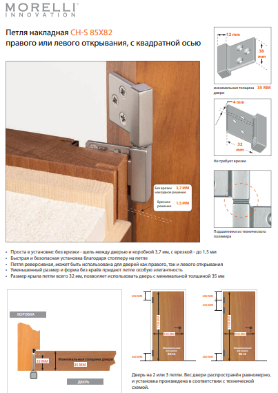 Итальянские карточные петли правого или левого открывания с квадратной осью устанавливаются на межкомнатные двери жилых помещений.