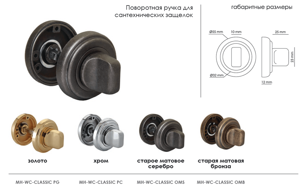 Сантехнические завертки Морелли предназначены для запирания двери в ванную или туалет. Изготавливаются из алюминия. Комплектуются по стилю и цвету с дверной ручкой.