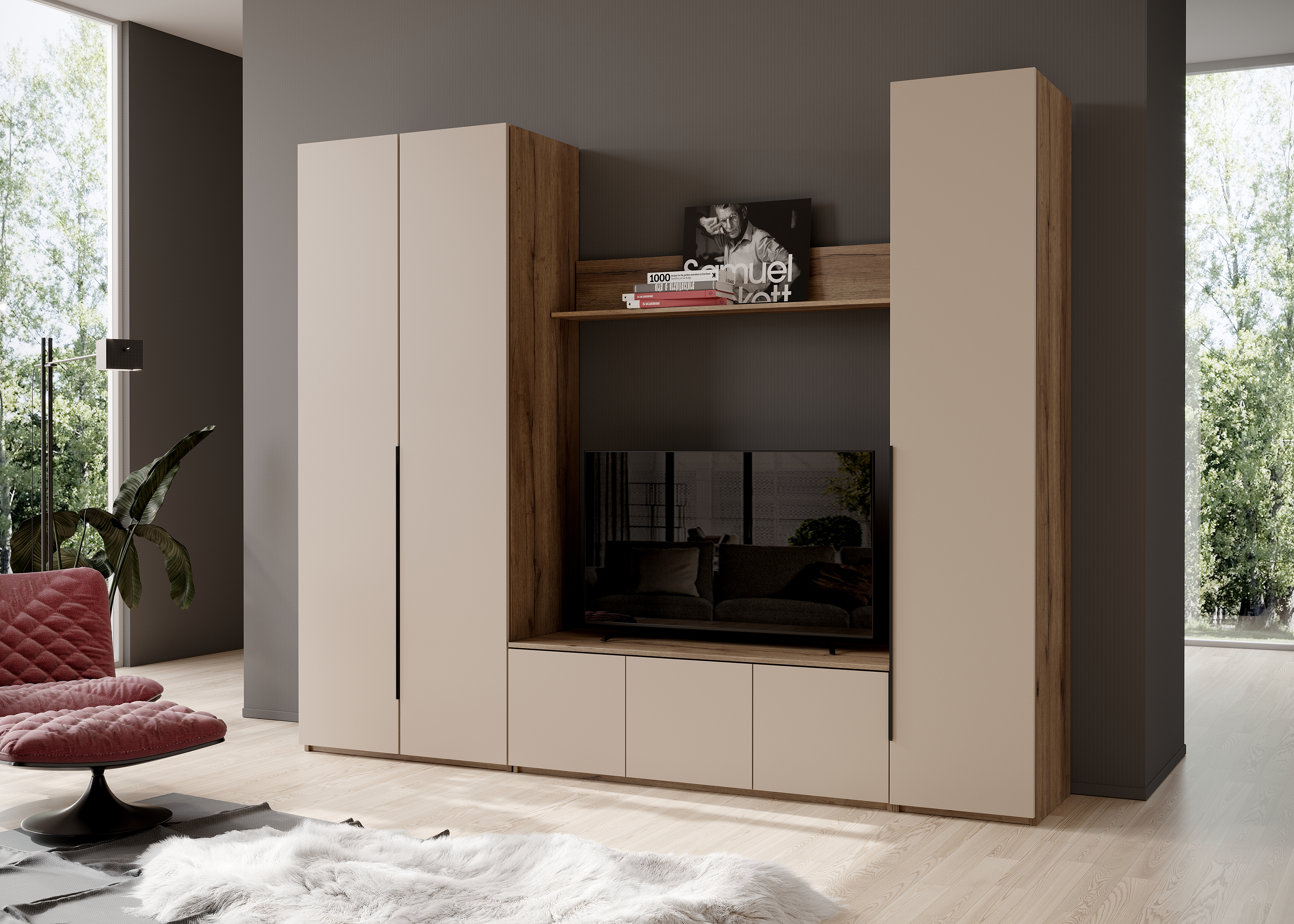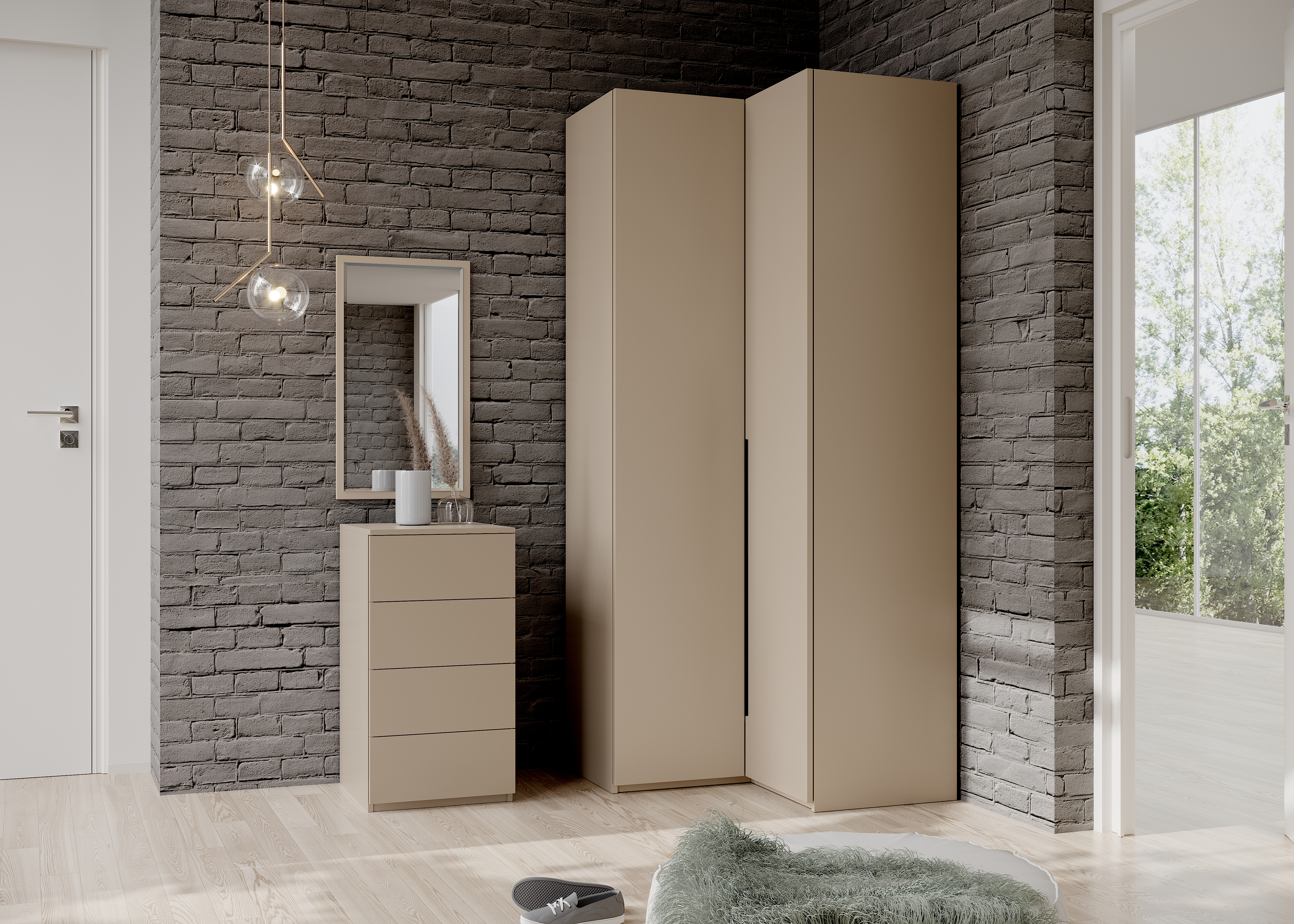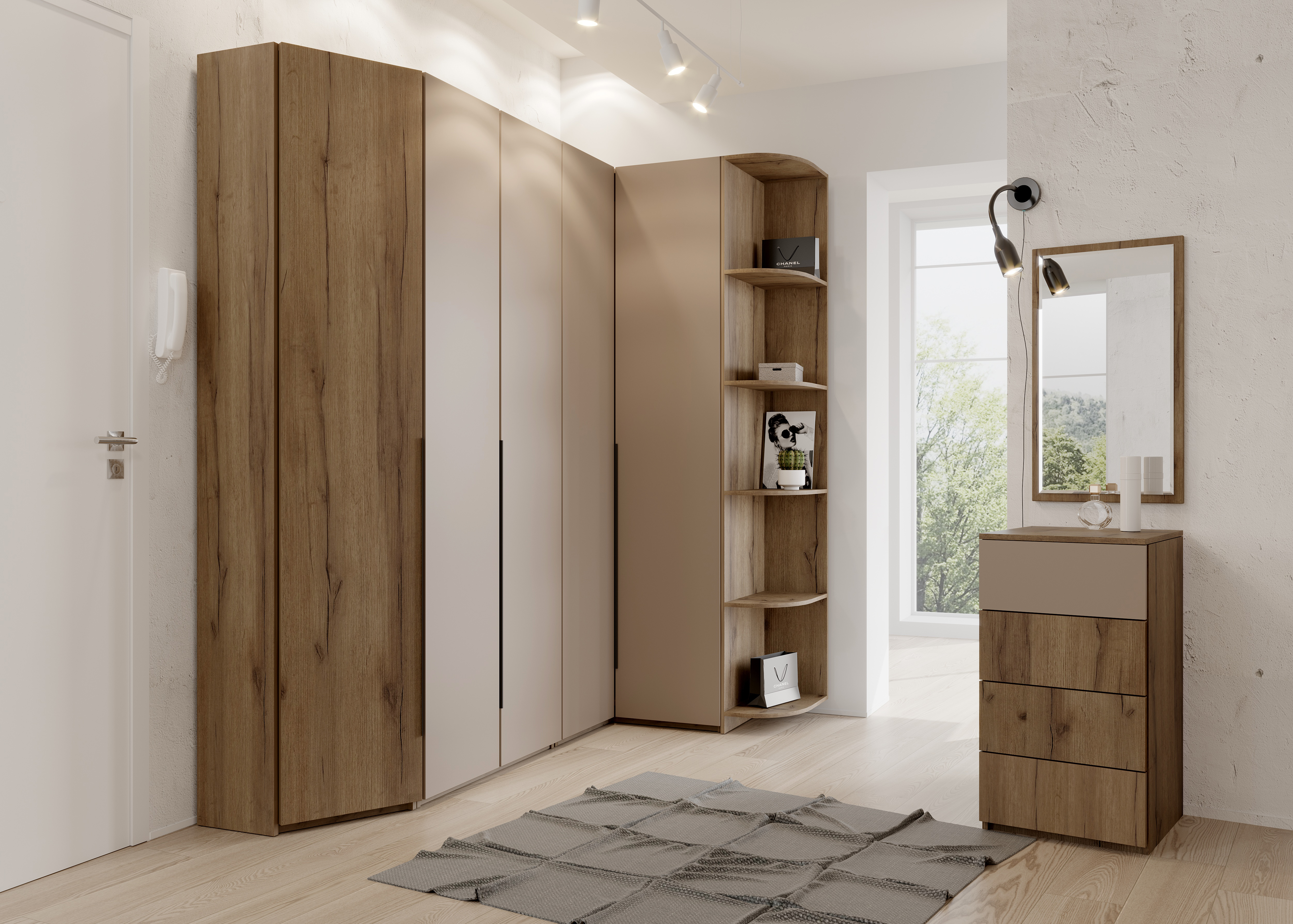 Один из основных трендов в мебельной индустрии – ничего лишнего. Именно этот посыл отражается в коллекции Лаунж. Лаконичный дизайн, строгие прямые фасады. На смену привычным ручкам пришли современные элегантные ручки-профиль. Часть модулей оснащена механизмами для открывания от нажатия без ручек. Новинкой предметного ряда является вместительный угловой шкаф.