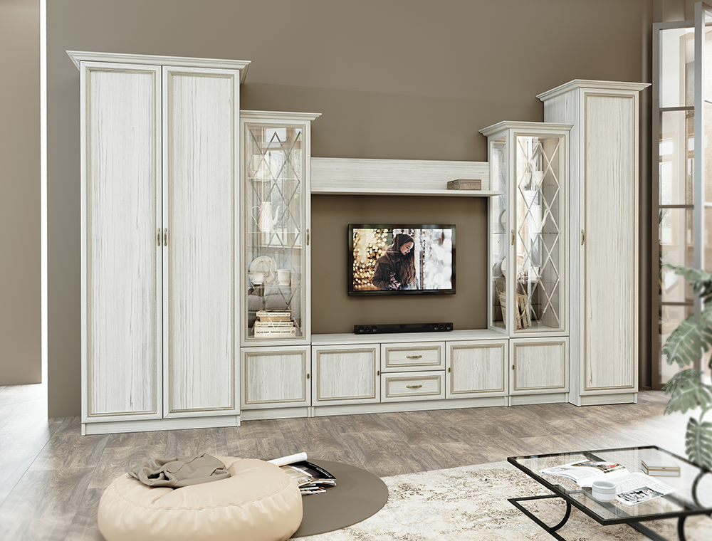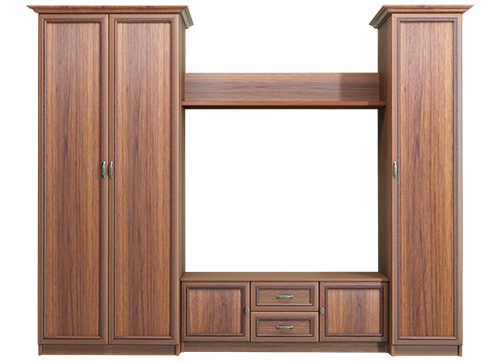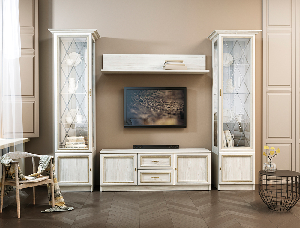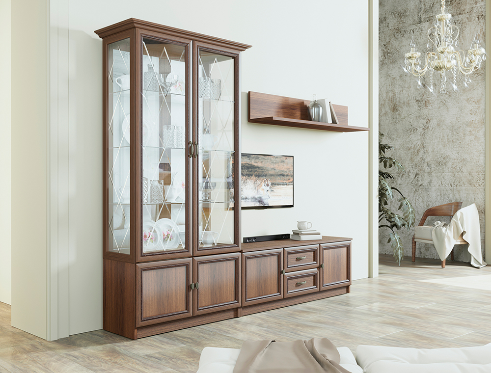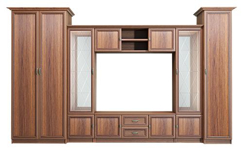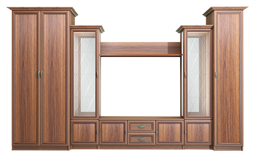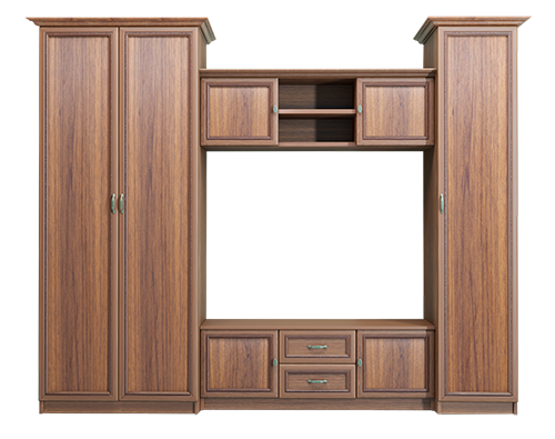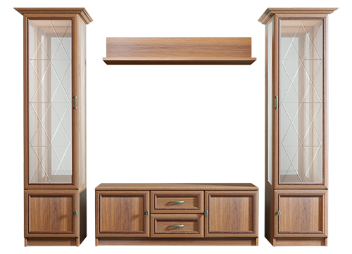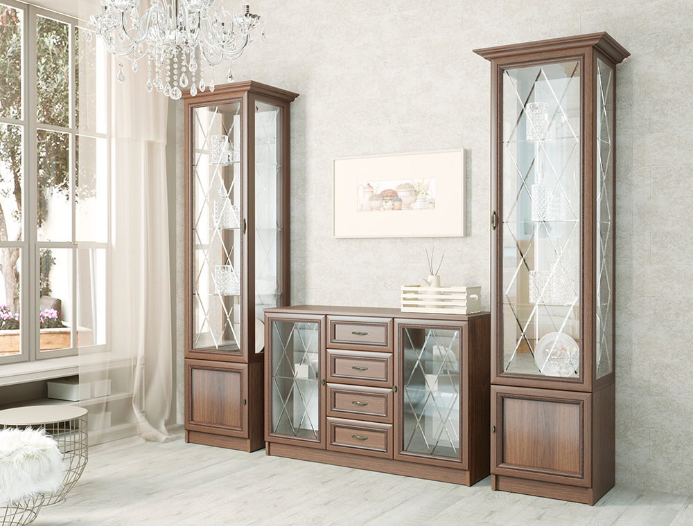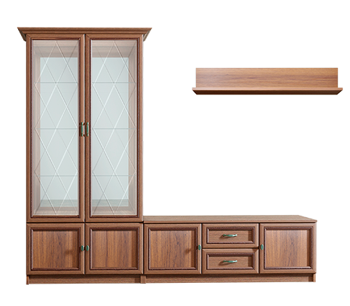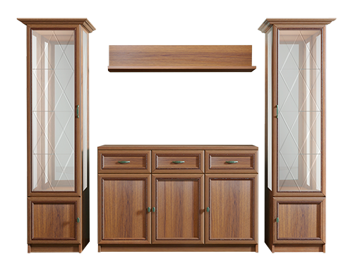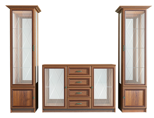 - корпус и фасад – ЛДСП 16 мм; кромка ABS 0,4 мм, крыши комодов – ABS 2 мм; фасад с рамочным профилем; карниз; стеклянные фасады – стекло прозрачное 4 мм или стекло с гравировкой;