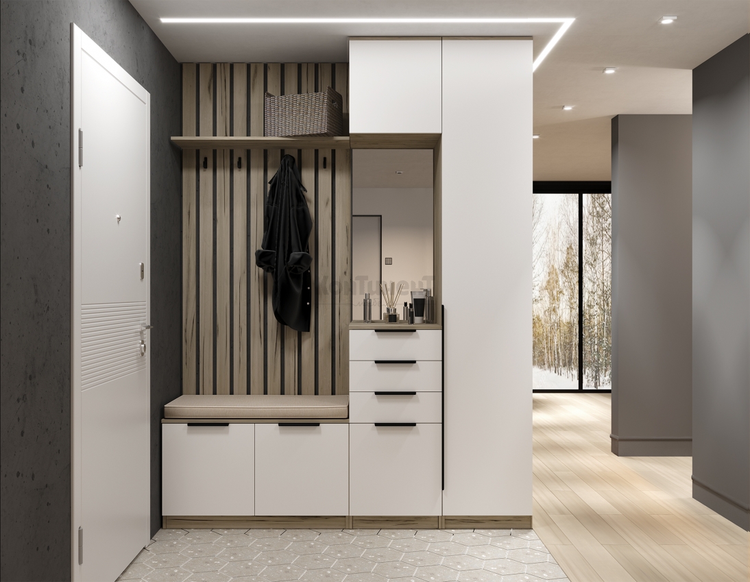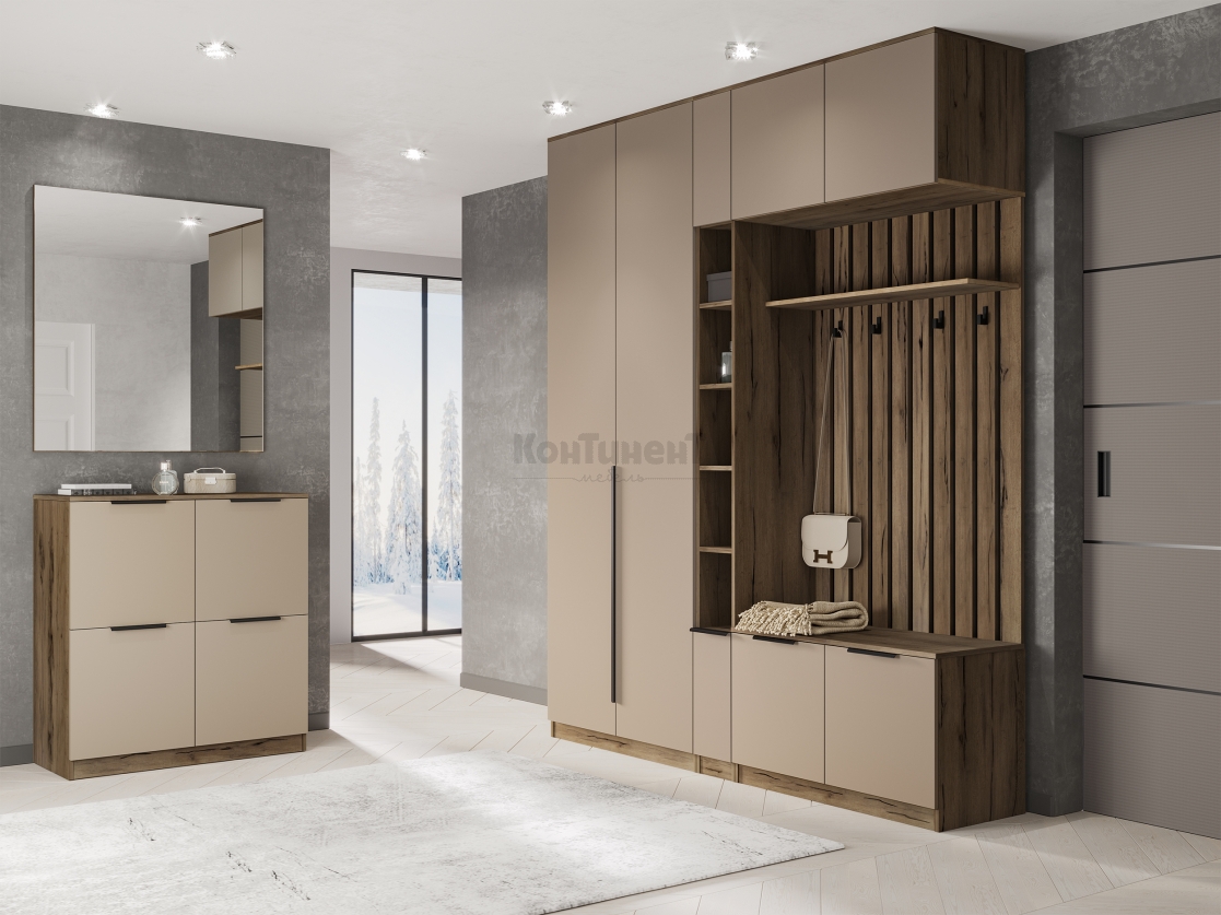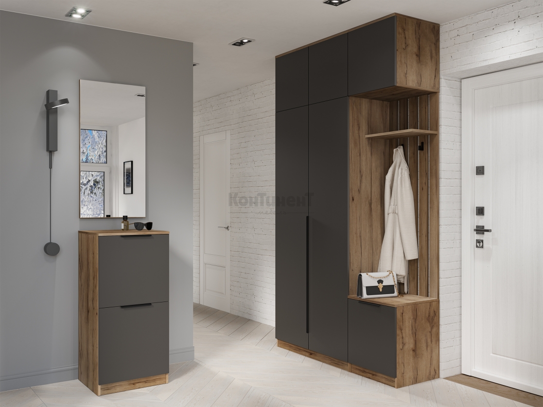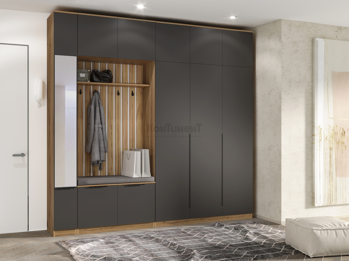 Прихожая «Авеню» создана для ценителей простого и практичного интерьера. Верхние антресольные фасады открываются от легкого нажатия. Строгие ручки-профиль черного цвета подчеркивают лаконичность стиля, а так популярная сейчас в дизайне помещений имитация реек – оживляет интерьер и придает коллекции изюминку.